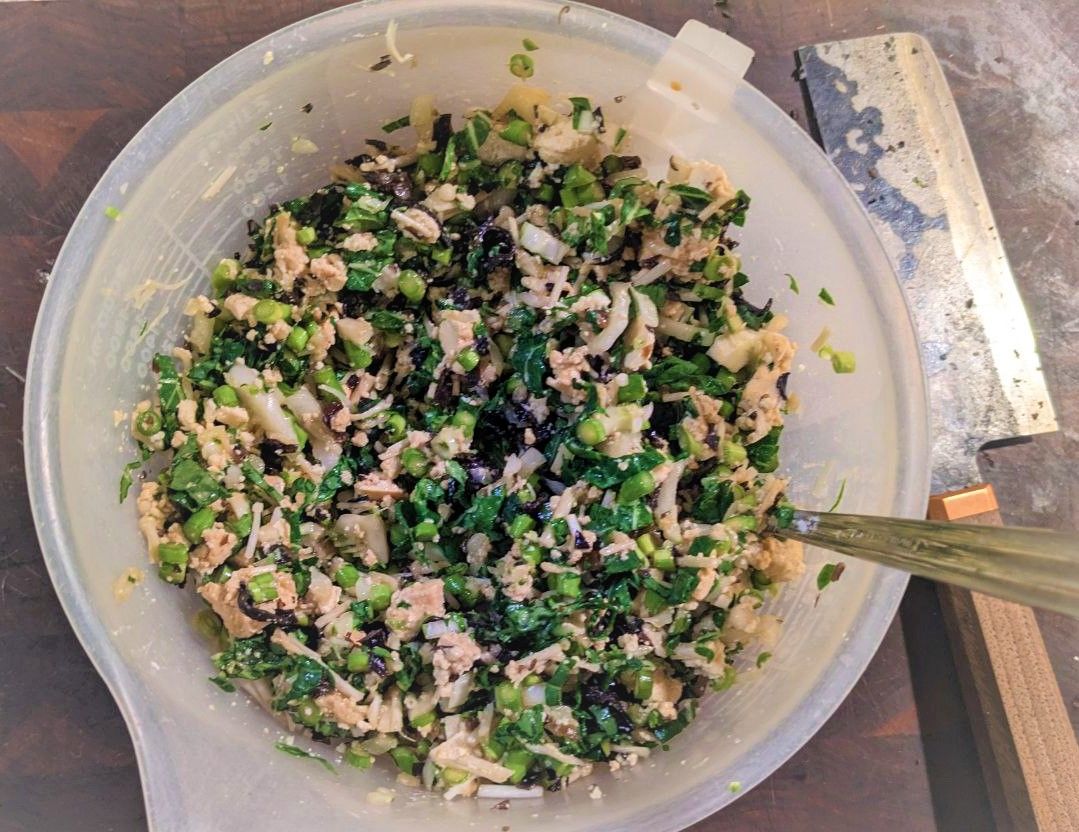4. Add the chopped mushrooms to the bowl and, crumble in the tofu before adding the soy sauce and corn starch. Mix well. Set aside while you make the dough.