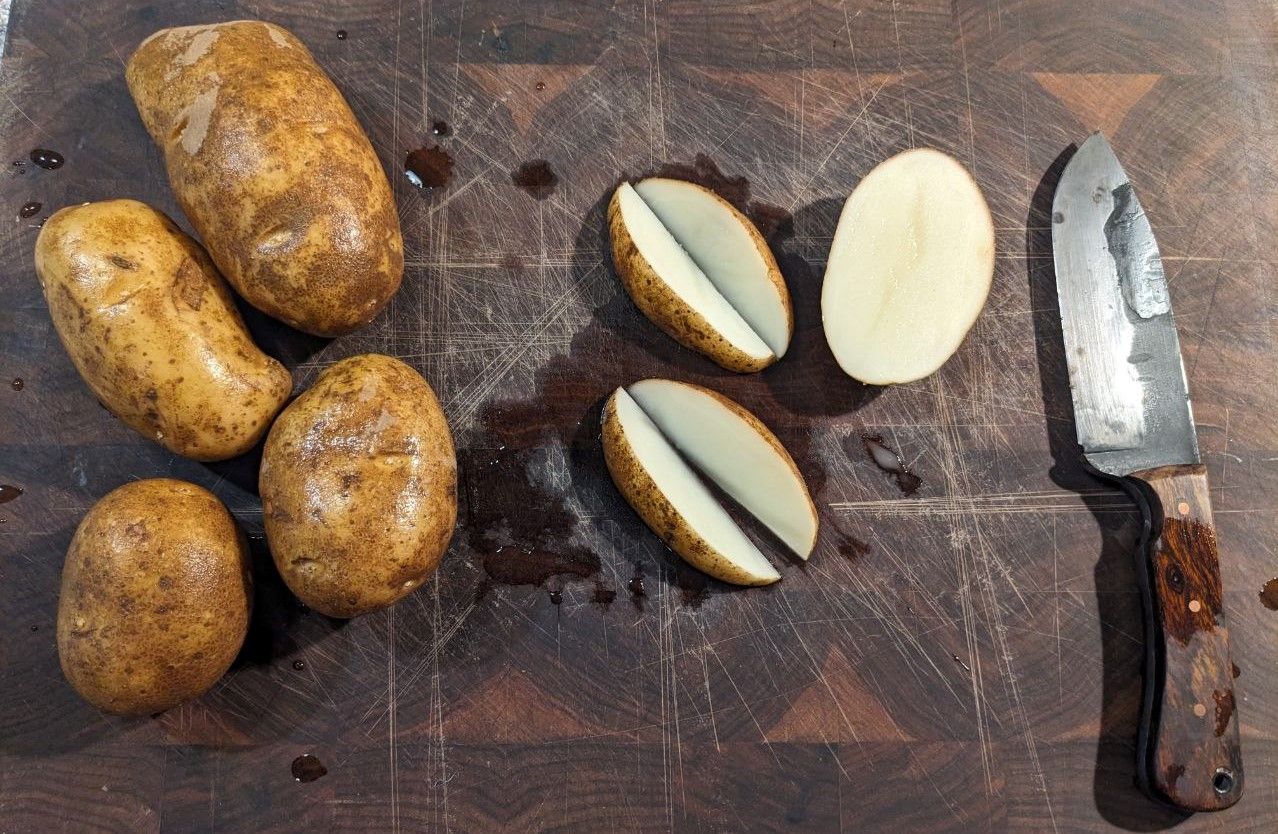 4. Cut the potatoes into wedges- I typically get about about 6-8 per potato by slicing in half lengthways first, then either in half, then half again, or in thirds lengthways.